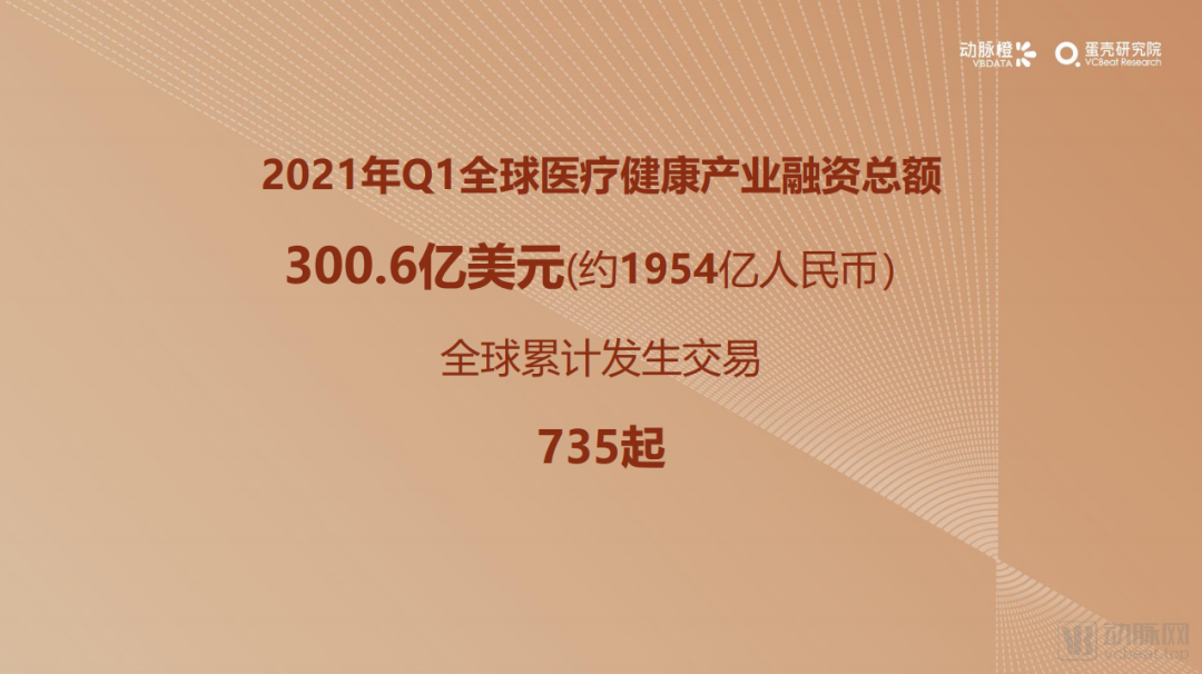 2021年Q1,全球医疗健康一级市场共发生735起融资事件,融资总额创新历史新高,达1954亿人民币,实现翻倍级增长;融资事件数也大幅上升75% 。可见在今年初,医疗产业就经历了一场资本大爆发。