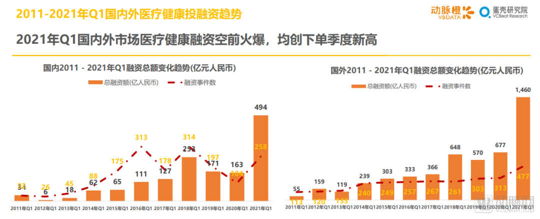 1.3 2021年Q1国内外市场医疗健康融资空前火爆,均创下单季度新高