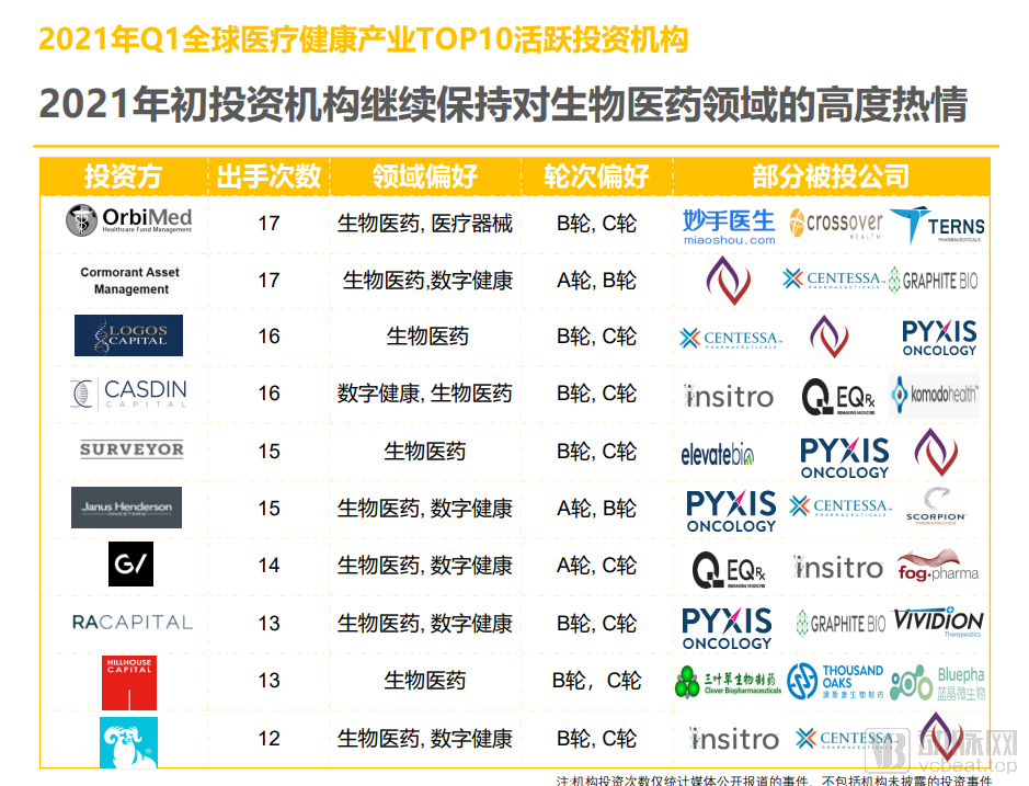 三、2021年Q1医疗健康活跃投资机构分析