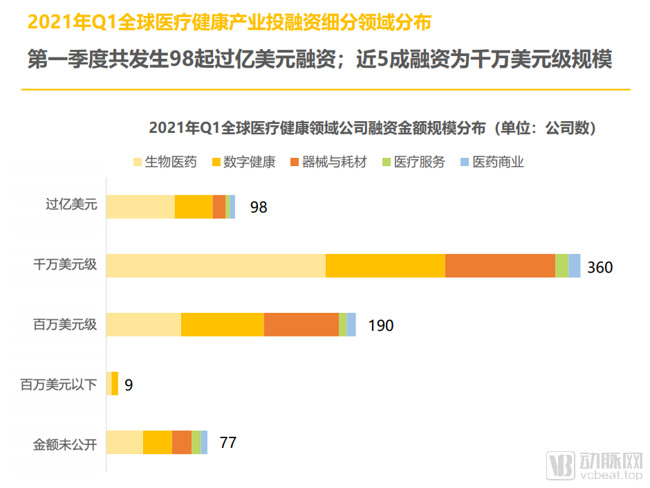 一.2021年Q1医疗健康领域一级市场盛况空前。一方面融资总额高:2021年Q1全球医疗健康融资额同比翻番,创单季度新高;另一方面本季度大额融资交易十分频繁:Q1共发生98起过亿美元融资;近5成融资为千万级美元规模。