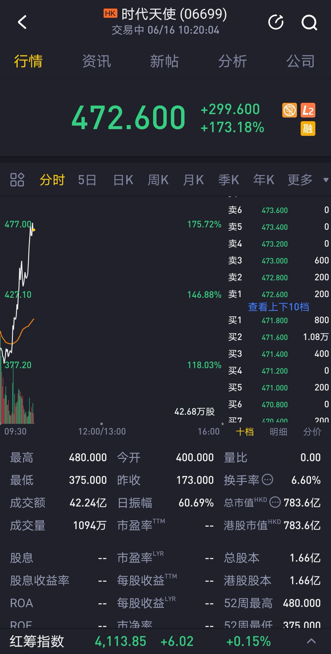 今日,时代天使正式登陆香港联交所,成为隐形矫治领域首个上市的中国企业,其开盘价400港元,较发行价上涨131.21%。截至上午10点20分,时代天使股价为472.6港元,涨幅达173.18%,市值783.6亿港元。