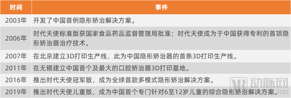 产品方面,2006年,时代天使研发的隐形矫治器正式获得CFDA审批的二类医疗器械注册证;同年,其隐形矫治技术成为中国获得专利的首项隐形矫治器治疗技术。在扩充产品线过程中,时代天使又推出了全球首款多模式隐形矫治解决方案,开创了中国首个专门针对6至12岁儿童的综合隐形矫治解决方案。
