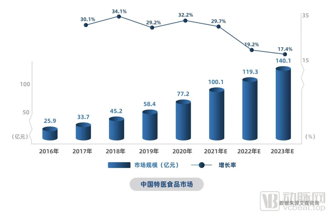 我国特医食品行业起步较晚,但近几年发展速度较快。中国特医食品行业市场规模从2016年的25.9亿元增至2020年的77.2亿元,增长至了原来市场的3倍规模,预计2021年将增至100.1亿元。