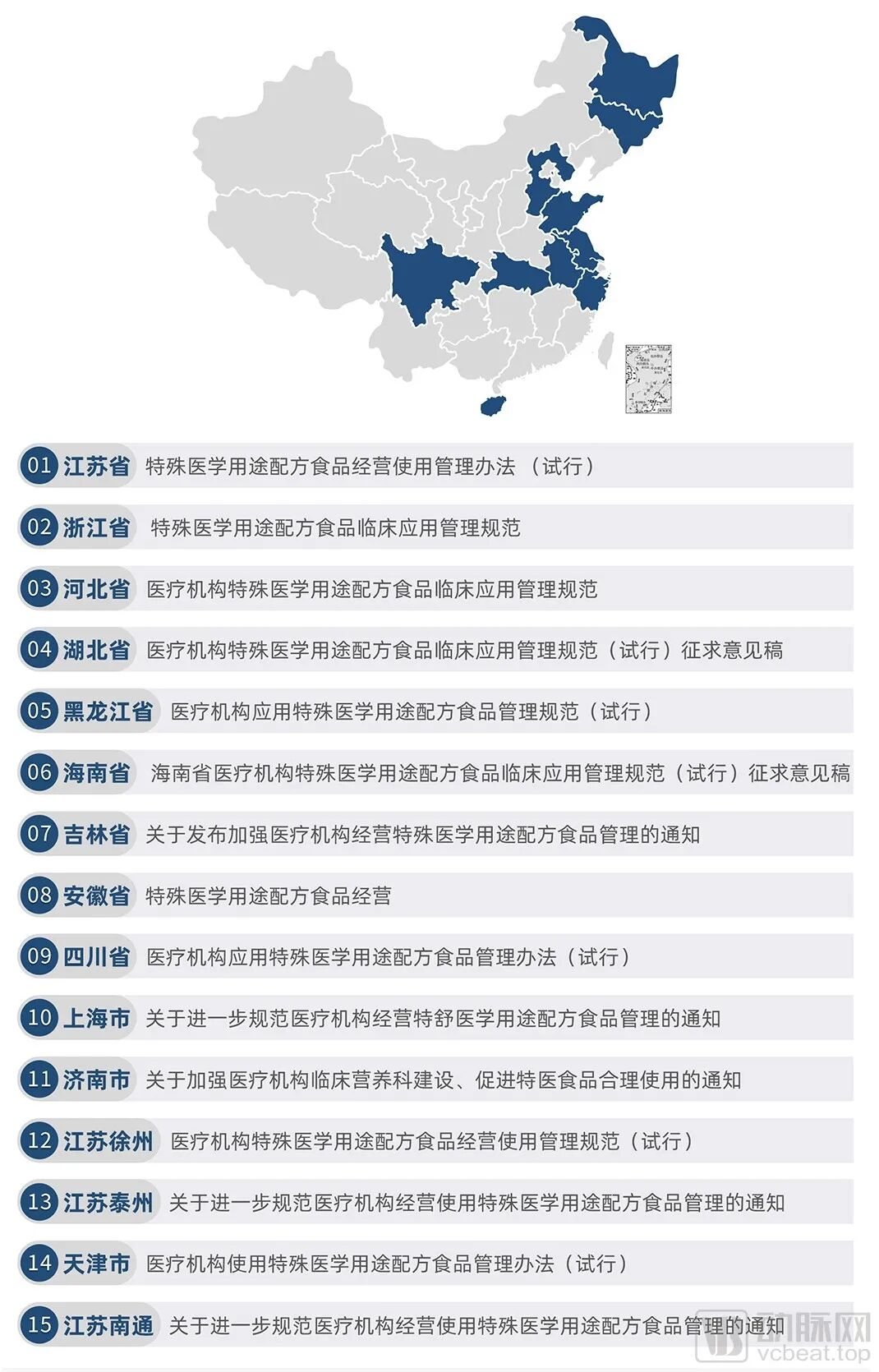 目前,我国地方政府正式出台特医食品相关法律法规的仅有江苏、河北、湖北、黑龙江、海南、吉林、安徽、上海、天津、四川、浙江及山东济南等地,且出台时间多在2020年-2021年。地方政府在逐步探索建立完整规范的特医食品法规。其中,江苏省是出台特医食品法规最多的省份,而济南市特医食品法规是我国首个地方性特医食品管理规范。