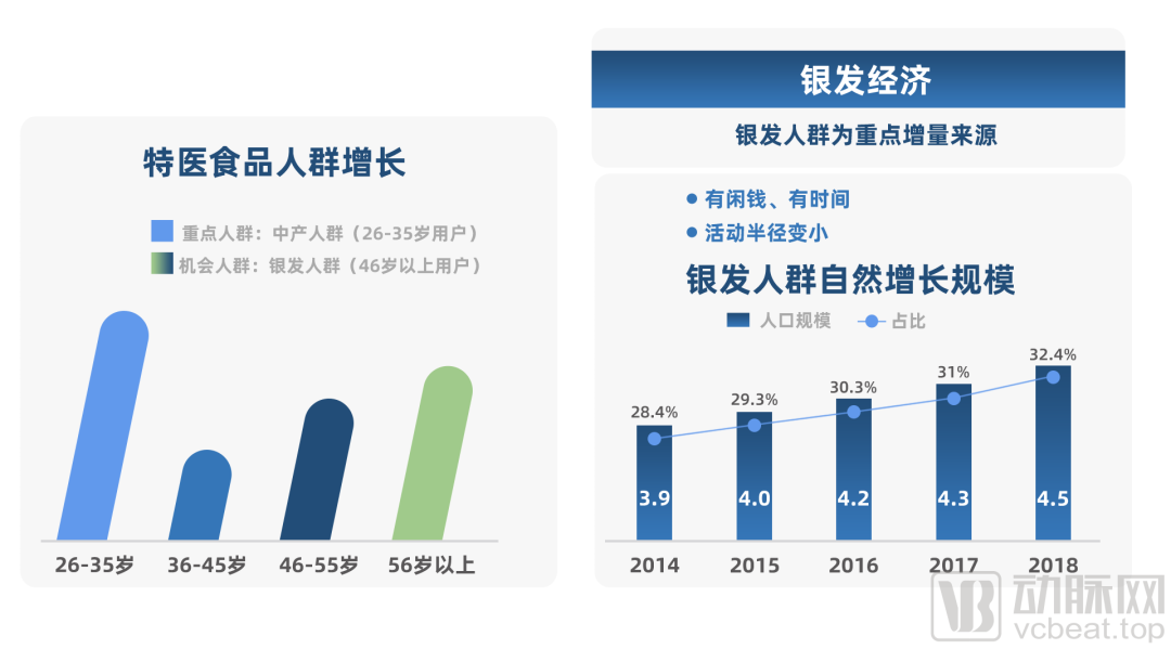 在26-35岁的中产人群消费特医食品高占比高增长的同时,银发人群也在逐渐成为重要的用户增长来源。