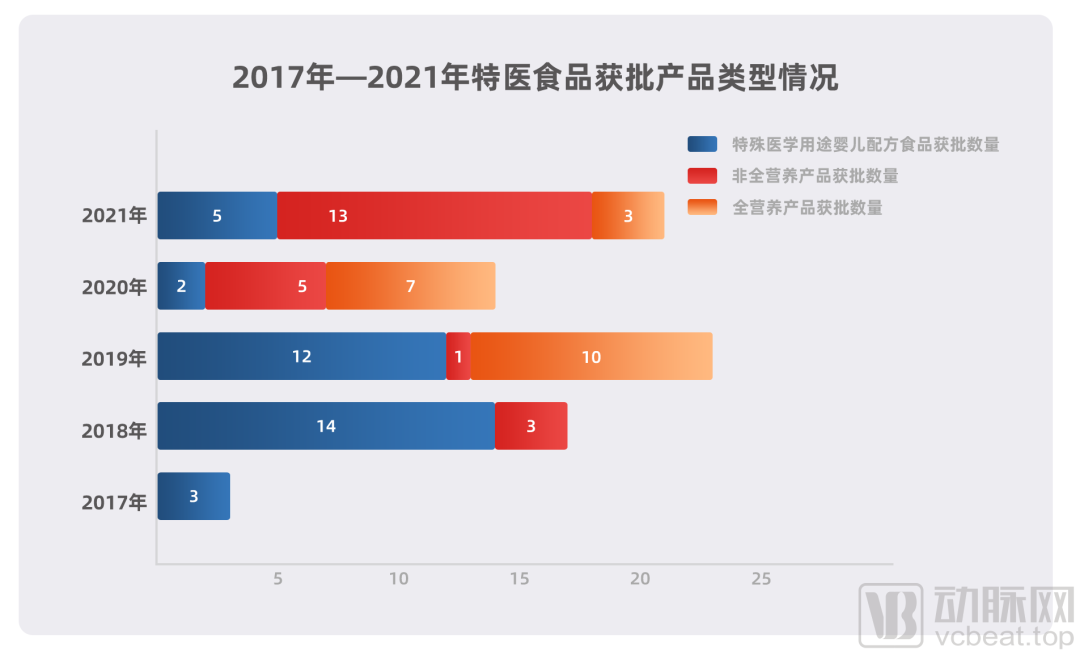 从当前获批产品数量类型来看,目前通过审批的特殊医学用途婴儿配方食品共36件、非全营养特医食品为22件、全营养特医食品为20件,特定全营养特医食品当前没有审批通过的产品。