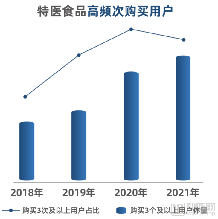 京东大数据显示,从2018年到2021年,京东健康特医食品用户数及人均消费增长均超行业平均水平。人均消费增长来自于两方面,包括人均购买次数的提升以及单次消费金额的提升。尤其是2020年疫情期间,居民对补充营养提高免疫力的食品需求进一步提升。