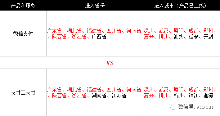 (数据来源:腾讯和蚂蚁金服公开信息 截止时间:2017年11月 注:红色为微信和支付宝相同的省份或地区)