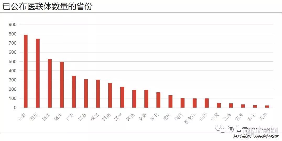 在各省最新公布的医联体数量中,山东、四川的医联体数量最多,分别达到790家(2018.5)、747家(2018.1)。而天津、北京、青海、上海、宁夏五个直辖市、自治区,其医联体数量均不到50个。