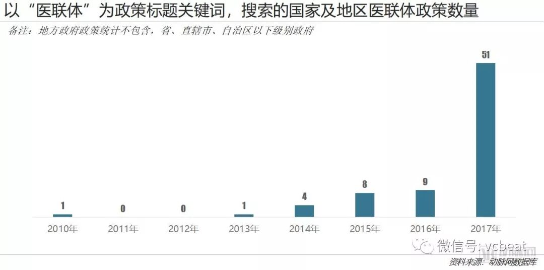 随着《关于加强医疗联合体建设和发展的指导意见》的颁布,医联体政策数量激增,每个省、直辖市、自治区都颁布了响应国务院政策的文件。实际上,地方政策文件的全面出台,是医联体政策总数激增的主要原因。