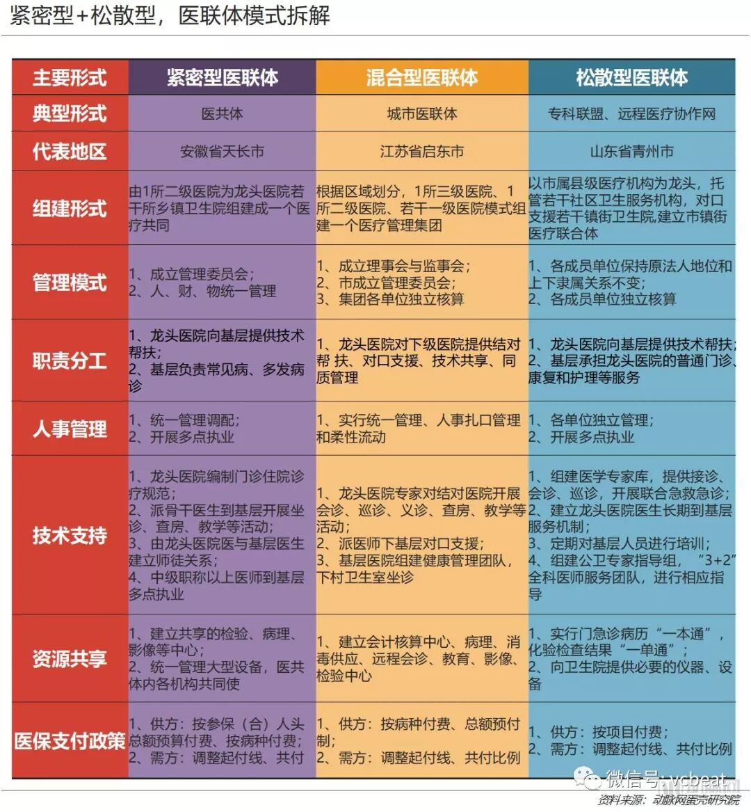 在各种医联体的具体差异方面,我们可以通过管理模式、职责分工、人事管理、技术支持、资源共享、医保支付六个维度的拆解对各个医联体的特性进行发掘。