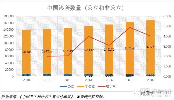 其中,城市诊所的增速远高于农村。六年间,农村的诊所复合增长率仅有1.48%,而城市诊所的复合增长率为5.07%。