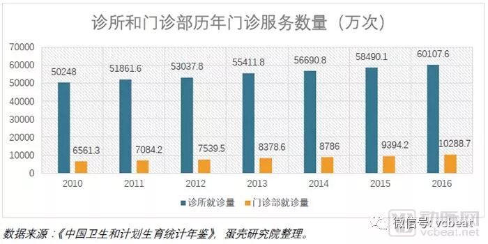 根据卫健委公布的公开数据,2009年新医改以来,诊所数量以每年6000~7000家的数量在快速增长。《中国卫生和计划生育统计年鉴2017》统计数据显示,2016年国内诊所已经达到了169367家。