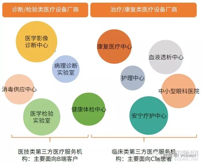 从产业链的上游看,医技类第三方医疗服务机构和临床类第三方医疗服务机构的主要供应方都包括医疗设备厂商,但是前者的需求侧重于诊断和检验类的设备,后者的需求侧重于治疗和康复类的设备。