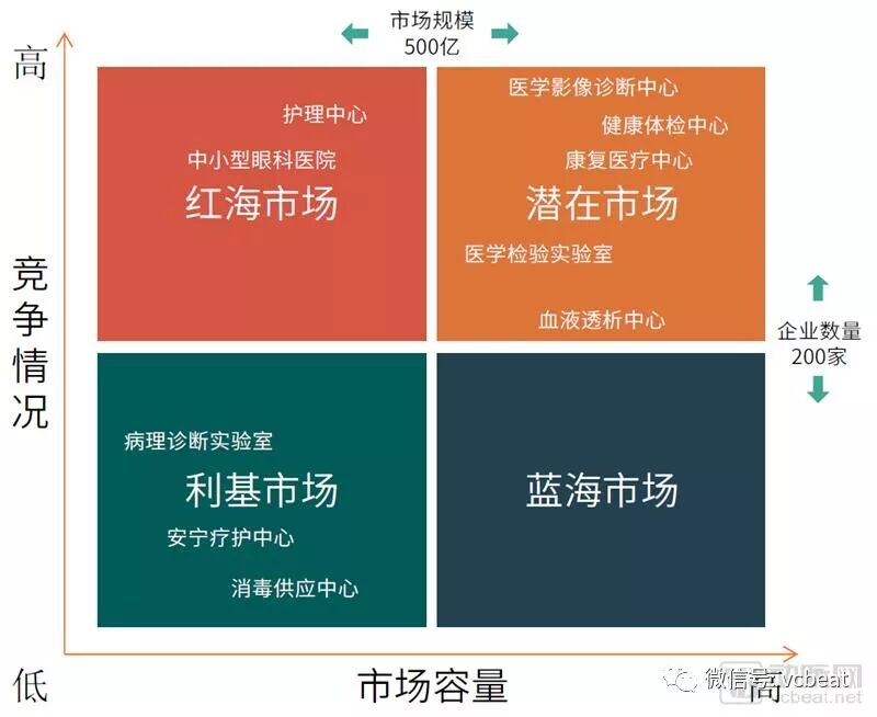 根据动脉网·蛋壳研究院对行业的认知积累,我们将第三方医疗服务机构按照市场容量(以市场规模在500亿人民币为分水岭)和竞争情况(以相关企业数量为200家为分水岭)粗略地划分为四种不同的市场: