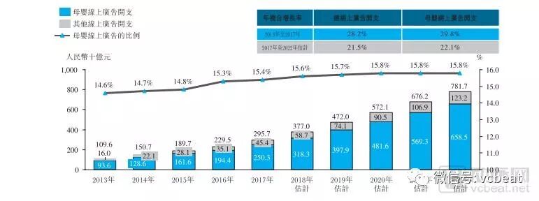 母婴相关线上广告市场的发展。中国线上广告市场规模显著扩大,由2013年的人民币1096 亿元增至2017年的人民币2957亿元,年复合增长率为28.2%。在互联网用户人数日益增加及科技进步的推动下,预计2017年至2022年中国线上广告市场将以21.5% 的年复合增长率进一步扩张。