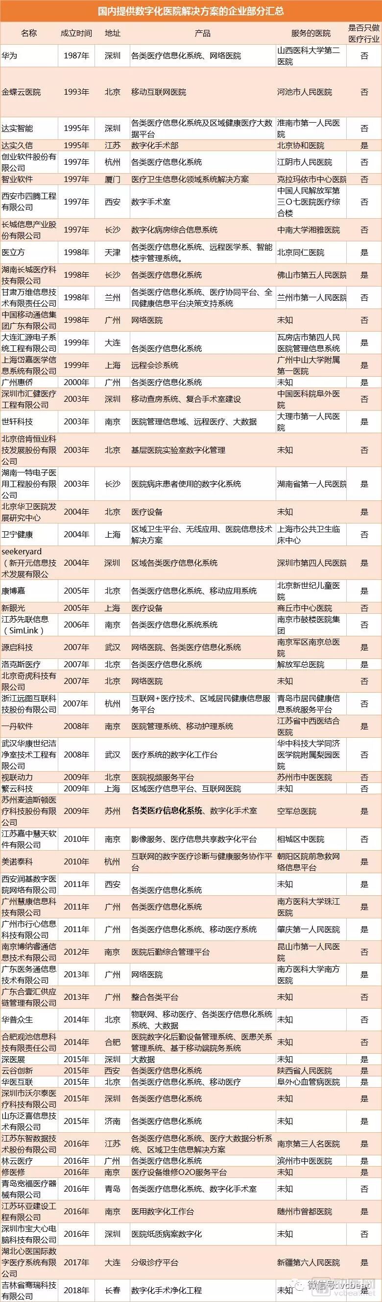 为此,动脉网梳理国内数字化医院发展历程,盘点了50多家为医院提供数字化医院解决方案的企业,希望解答这些疑惑。