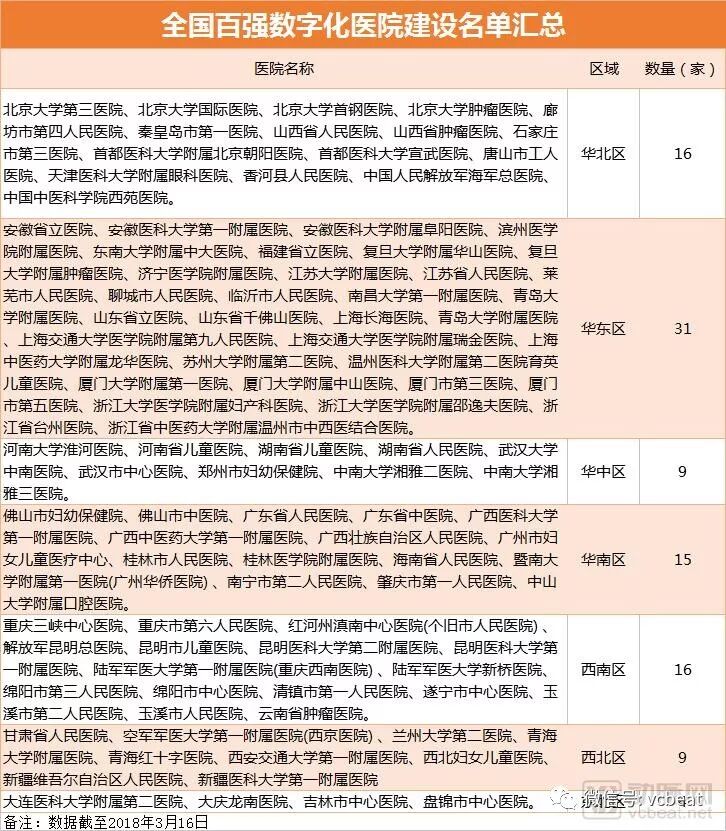 根据HC3i中国数字医疗网2018年3月公布关于全国数字化医院建设成果数据显示:来自全国26个省份的100家医院带来189个重点项目,综合医院80家,肿瘤医院、妇儿、口腔等专科医院16家,中医院4家。具体名单如下: