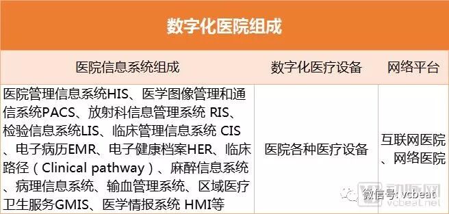 即数字化和医疗设备、医院信息系统(HIS)、医学影像和通信系统(PACS)和办公自动化系统(OA)。其特征:无纸化、无胶片化、无线网络化。
