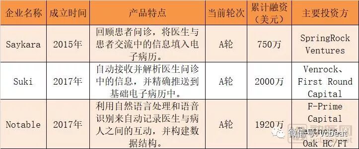不同于以上的大型企业单独推出语音服务,Saykara、Suki、Notable几家初创公司则更专注于语音识别技术在电子病历上的应用。