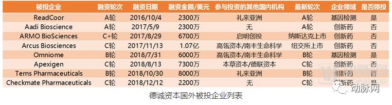 虽然德诚资本在国内医疗健康领域没有频繁的出手,但是在国外投资上却表现的很活跃。目前为止已经投资了8家企业,并且其中有2家成功退出。