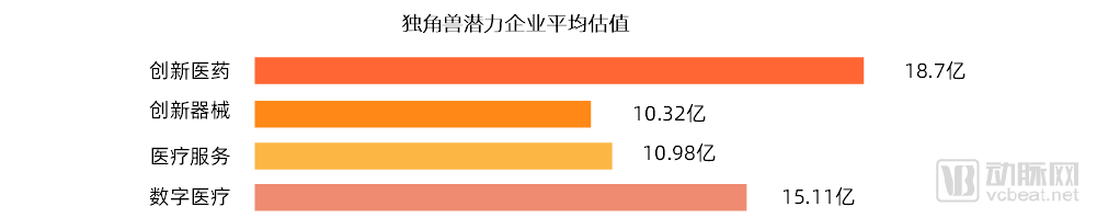 从平均估值的角度来看,创新医药领域的独角兽潜力企业的平均估值最高,达到18.7亿人民币,高于其他三个细分领域,这与创新医药研发周期长、成本高、技术壁垒等因素密切相关。所以,尽管本次没有筛选出创新医药类的独角兽企业,但是该领域内的独角兽潜力企业只要成为独角兽企业,那么其企业的估值将高于其他三个细分领域。