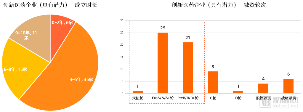 数据显示,目前创新医药类的独角兽潜力企业总计67家,其中有35家企业成立于3~5年以内,占比超过50%,有15家企业于6~8年以内。相对于创新医药的研发周期从临床靶点筛选到最终上市,平均13.5年的时间,榜单内的大部分创新医药类企业都还处于“青少年期”。