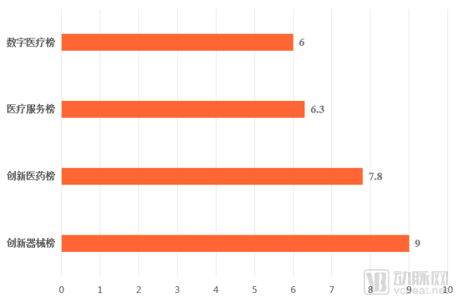创新器械类企业上榜所需时间最长,平均需要9年时间,主要是因为创新器械榜单上的企业成立时间都相对较早,这一特点也与医械行业的门槛和技术积累密切相关。
