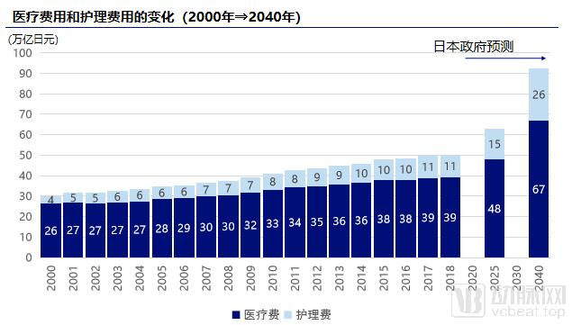 随着老龄化程度进一步加剧,老年抚养比也将由2000年的1:3.6,预计到2040年的1:1.4。因此,医疗费用和护理费用今后仍将持续增长。