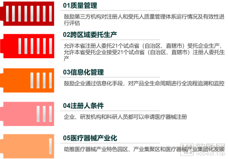 通过对21个省份医疗器械注册人制度试点政策的梳理,对医疗器械研发外包服务行业影响较大的有质量管理、跨区域委托生产、信息化管理、注册人条件和医疗器械产业化5个方面的内容。
