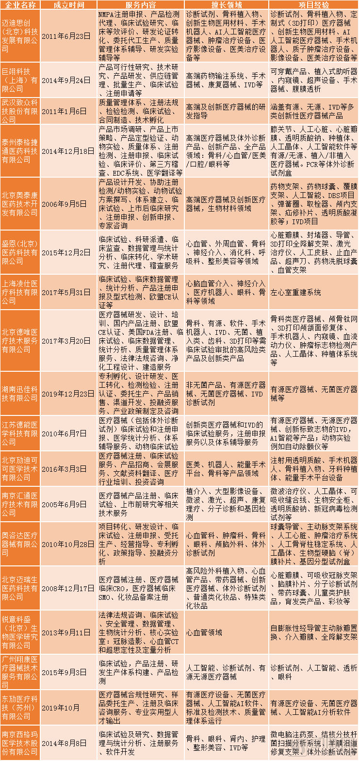 注:以上是医疗器械研发外包服务行业部分代表企业,未穷尽显示,企业排名不分先后