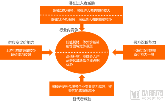 器械CRO服务潜在进入者的威胁较大,器械CDMO服务潜在进入者的威胁较小。器械CRO服务高度依赖人才,一旦新进入者有人才优势,就会对现有企业造成威胁。而器械CDMO服务除了对人才的依赖外,增加了资金、实验室设备、生产设备等资源要素的投入,行业进入门槛提高,潜在进入者的威胁较小。