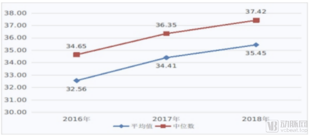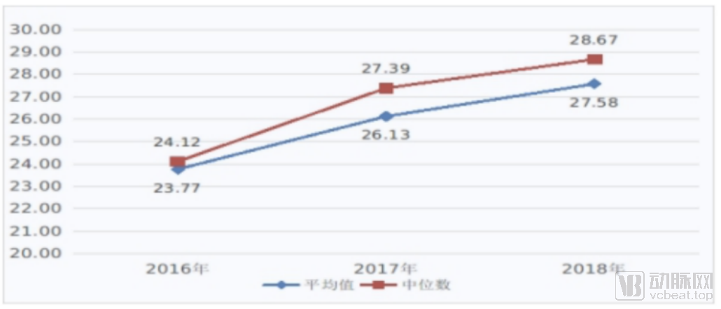 图1:2016-2018年医疗服务收入(不含药品、耗材、检查检验收入)占医疗收入比例(%)