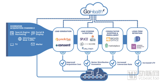 GoHealth的服务模式是,当消费者在其平台上进行在线或电话互动后,就进入了GoHealth以数据为导向的全渠道营销流程,GoHealth会使用LeadScore(其专有的机器学习技术之一)实时评估消费者线索。