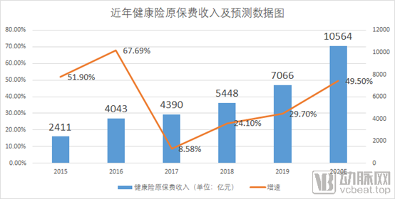 2019年,我国健康险原保费收入为7066亿元,同比增长29.7%。2020年第一季度,虽然受疫情影响,健康保险保费收入2641亿元,同比增长21.6%。在过去5年,整个行业的年复合增长率更是接近30%,按增速预计,今年我国的健康险市场,将达到万亿级别。
