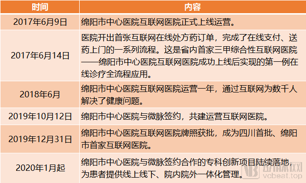 绵阳市中心医院发展互联网医院的主要时间节点,资料来源:医院官微、合作企业等,动脉网制图