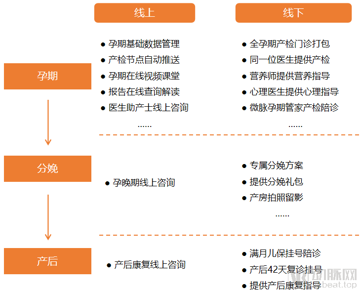 2020年1月3日,双方合作的首批专科创新服务正式上线,即孕产一站式服务、流产关爱服务、儿童关爱一站式服务。其中,孕期管理服务由专属医生团队在互联网平台为孕妇提供全孕期的管理,减少孕妇到院次数和院内候诊时间;儿童保健服务也是类似,通过互联网平台为新生儿和儿童的生长发育、健康成长提供专业咨询指导,避免新生儿的交叉感染;流产关爱服务关注术后专属医生跟踪回访,通过线上咨询问诊,减轻患者心理负担,减少流产后并发症的发生,并为流产后备孕患者提供指导等。