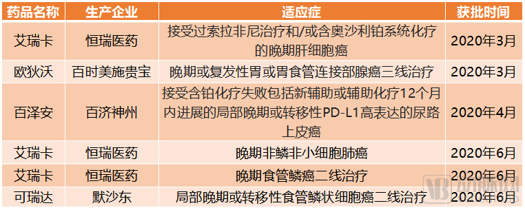 2020年上半年获批的PD-1单抗新适应症