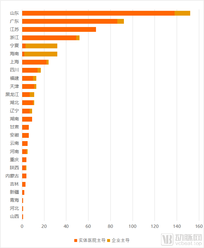 互联网医院按主导方的地区分布,资料来源:各地卫健委、医院官网官微,蛋壳研究院制图