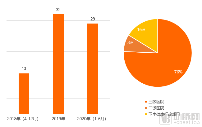 2018年互联网医疗与互联网医院新政出台,当年中标项目暂时不多。2019年,实体医院建设互联网医院逐渐进入高峰期,全年公开的中标项目有32个。