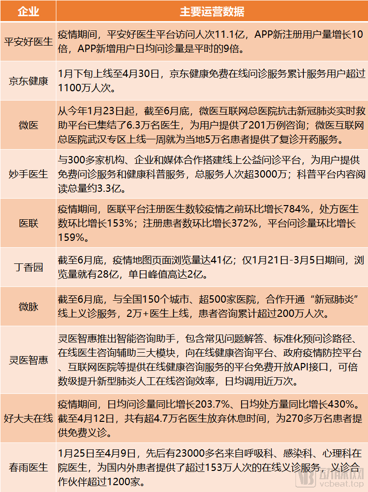 部分互联网医疗企业或项目疫情以来的主要运营数据,数据来源:企业及公开报道,蛋壳研究院整理