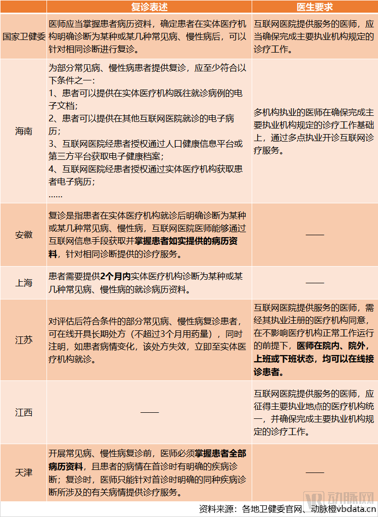 尤其是在如何界定复诊、如何平衡医生线上线下执业关系等关键环节,国家卫健委仅在《互联网医院管理办法(试行)》中作出了框架性表述,此后地方卫健委在相应的管理办法、实施细则中提出了更为具体的做法。海南规定了复诊的6个条件,满足之中之一即可。江苏对医生线上执业的态度最为开放,只要医生不影响线下医疗机构的正常工作,在院内、院外,上班或下班状态,均可在线接诊。