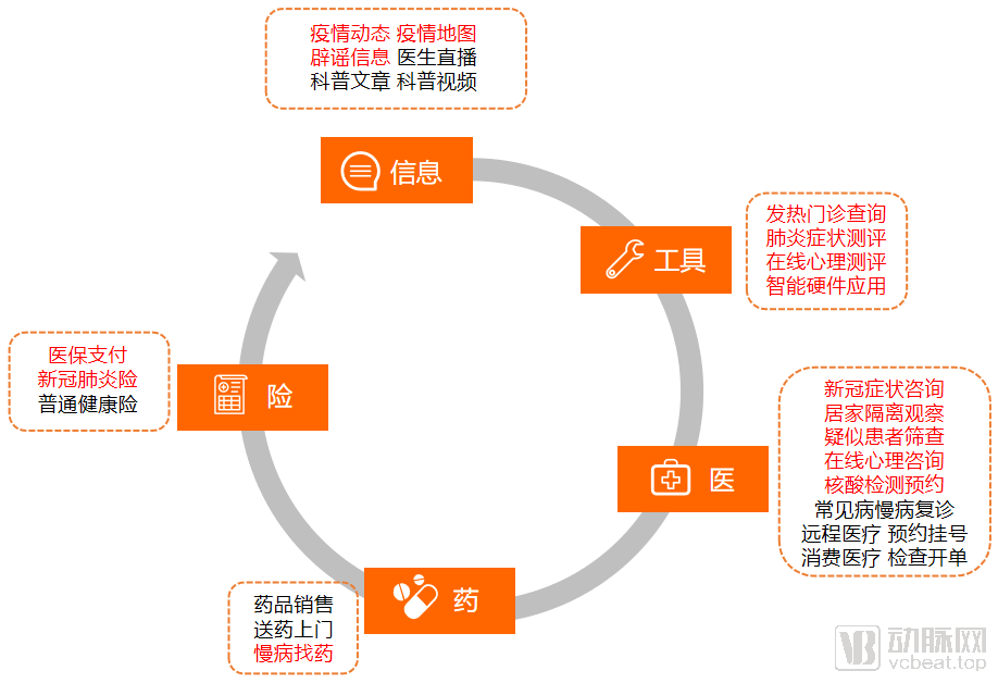 如上图所示,疫情期间互联网医院总共发展了五大服务环节。其中,红色字体为主要针对疫情防控、或在此期间有重大突破的服务,黑色字体为日常服务。当各环节流程更加畅通之后,企业能够高效整合服务、技术资源,进行流程优化或重构。
