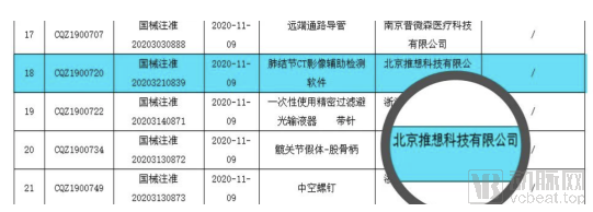 11月13日,国家药品监督管理局的官网上放出了首个基于深度学习技术的肺结节CT影像辅助软件医疗器械批准证明。这是国药监开出的首张肺结节AI三类证,它归属于总部位于北京的推想科技。
