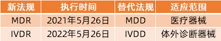 值得一提的是,在欧盟医疗器械分类当中,将医疗器械划分为医疗器械(MD)和体外诊断器械(IVD)两大类,目前受到新规MDR管辖的仅限于MedicalDevices,体外诊断器械的相应新规IVDR(EU2017/746)的执行时间为2022年5月26日,也就意味着IVD器械厂商还有一年的时间可以缓冲和适应新规变化,并做好应对准备工作。