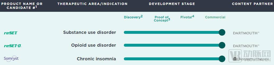 Pear已有三个产品获FDA审批并上市销售:用于物质使用障碍的reSET,用于阿片类药物使用障碍的reSET-O,以及用于慢性失眠治疗的Somryst。