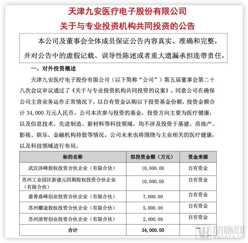 近日,九安医疗公告称,拟以自有资金投资5家基金,投资合计金额3.4亿元,投资方向主要为医疗健康,以及信息技术、先进制造、新材料等科技领域。九安医疗期望通过做LP的方式,为公司发展找到新的增长点。