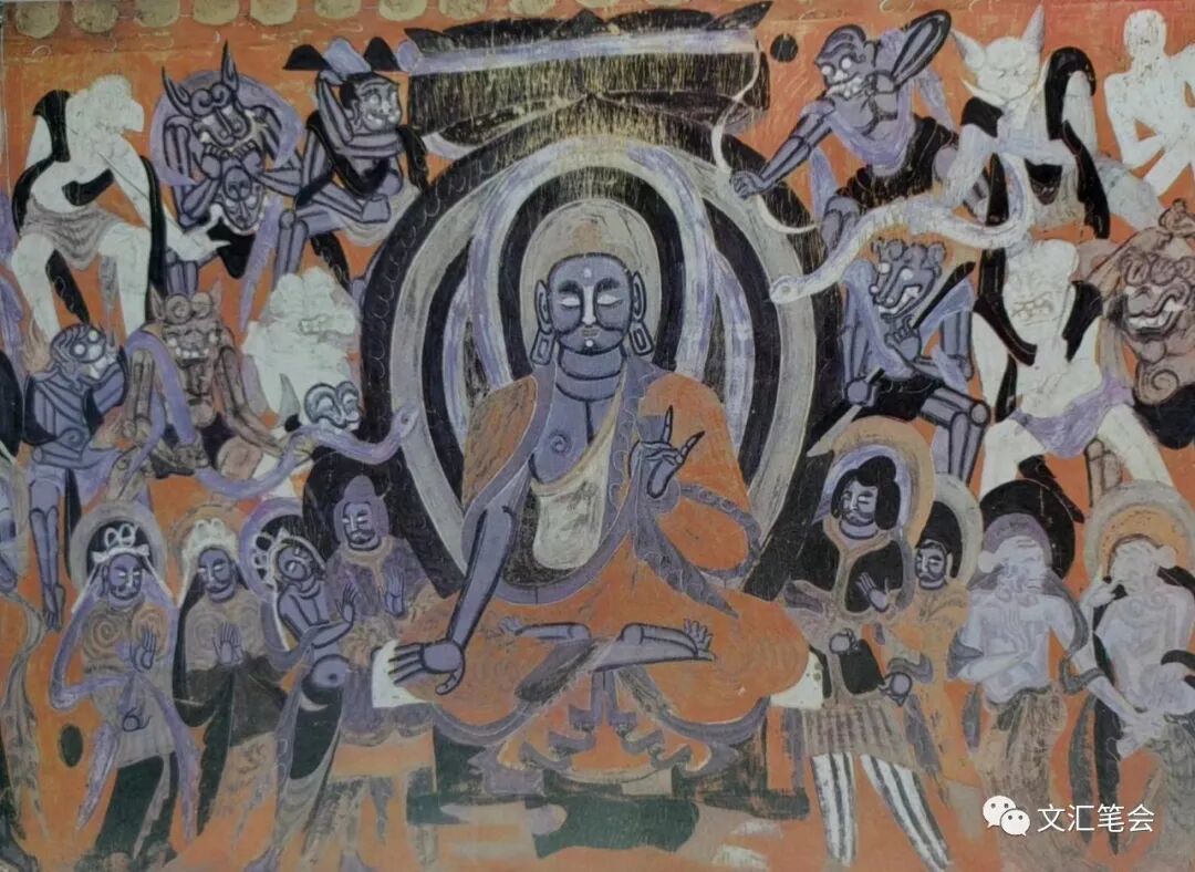 这一故事,在克孜尔石窟、库木吐拉石窟、敦煌莫高窟、云冈石窟的壁画、浮雕中多有表现,名为《降魔变》。以莫高窟428窟的北周壁画(下图)为例,释迦结跏趺坐于画面中央,结降魔印,安忍不动,默如雷霆;上方为群魔乱舞,张弓、搭箭、持枪、抡斧、执蛇,气势汹汹地向佛扑去;下方左侧为三魔女青春靓丽向佛献媚,右侧已变成三个丑婆,“头白面皱,齿落垂涎,肉削骨立,腹大如鼓”,自惭形秽。这刹那之间的美丑衰变,与栀子花的由极清纯而极污秽,不正相吻合吗?则即使栀子不是薝蔔花,也应是天魔女,与佛教的说教是脱不了干系的。