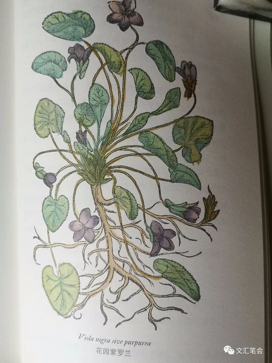 其实这本书是有配图的(下图),图里分明画的是叶子为心形、开着单瓣紫色小花的香堇菜,下面还用拉丁文写着Viola nigra sive purpurea,也就是“黑色或紫色香堇菜”的意思。译者如果熟悉植物的话,看了图就可以知道这里说的是香堇菜,不是紫罗兰了。