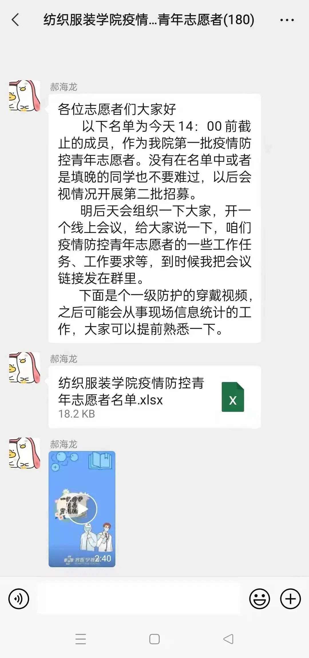 “纺织服装学院疫情防控青年志愿者团队”由近200名学生组成,他们涉及本科、硕士、博士各年级,并包含党员、团员、群众等不同身份,主要承担了校园内的口罩督导任务,呼吁同学们正确佩戴口罩,并随时待命,抗击疫情。不论是组队,还是领取任务,他们都积极且迅速的站了出来,为校园疫情防控贡献纺院青年的力量,展现了纺院人的责任意识和使命担当。